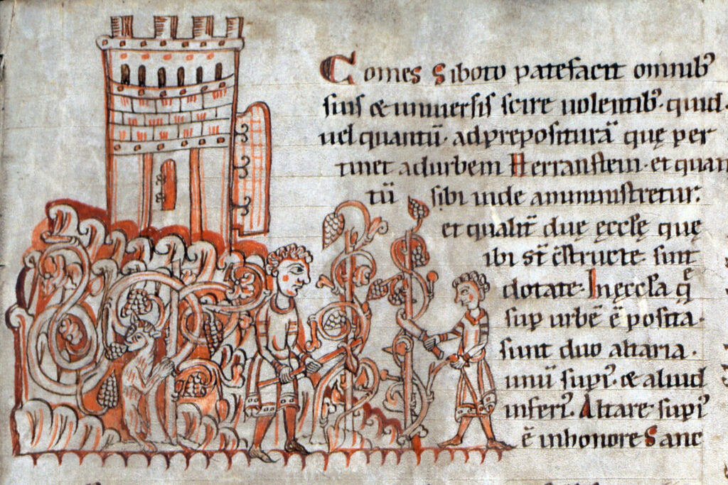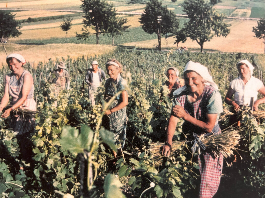 Im August wurden die überlangen Reben abgeschnitten bzw. eingekürzt (“Wipfeln“). Das Abschneiden der Strohbänder und das Ausziehen und Lagern der Weinpfähle war eine Arbeit nach der Lese im Spätherbst.
